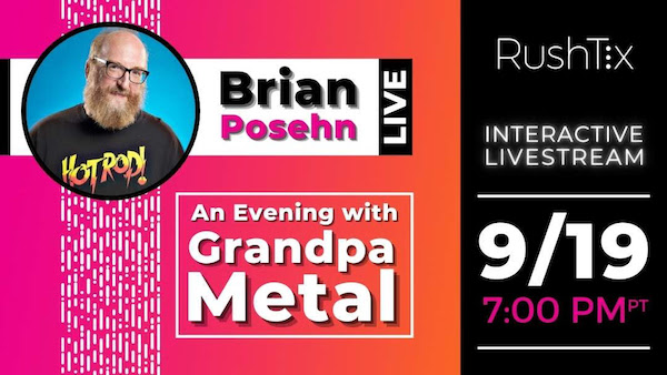 Heavy metal’s nerd extraordinaire, BRIAN POSEHN, implores you to see him with his shirt ON this Saturday, September 19. (For the love of rock, PLEEZ!) The gifted entertainer will perform an hour (or more) livestream of stand-up comedy to your comfy pad for digital monies. At BRIAN POSEHN LIVE: An Evening with Grandpa Metal, you will enjoy celebrating the release of Brian’s album “Grandpa Metal” with hard core comedy and heavy metal tunes. So who is this Brian person? You will know him from the Netflix show Lady Dynamite, FX’s You’re The Worst, his recurring roles on The Big Bang Theory and New Girl. He was one of the stars of the Comedy Central show The Sarah Silverman Program, as well as one of the original members of the Comedians of Comedy.