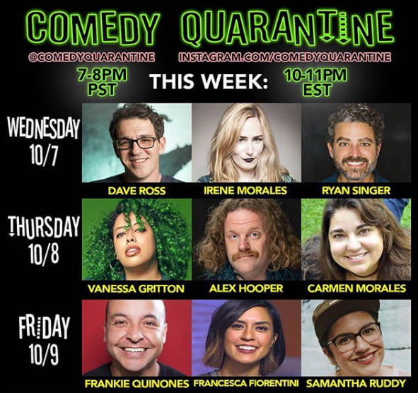 Mentions: Each show starts at 7pm PT/ 10pm ET. Watch live on Instagram @comedyquarantine. Venmo @nakedcomedy to support the comics.