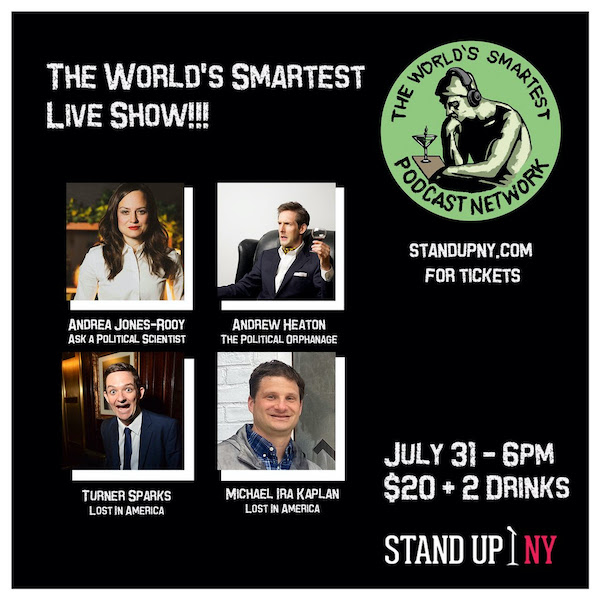 Who says thoughtful conversation and humor are dead? Looking for an escape from the dog-eat-dog world of social media, clickbait, and faceless trolling? Then join hosts of the World’s Smartest Podcast Network as they bring NYC a live hour of standup comedy and light-hearted political discourse at Stand Up New York. This Saturday, July 31st, Andrea Jones-Rooney (Ask A Political Scientist), Andrea Heaton (The Political Orphanage), Turner Sparks (Lost in America), and Michael Ira Kaplan (Lost in America) will take on topics like the Olympics, billionaires in space, and so much more at The World’s Smartest Live Show! Grab those tickets while you use a trampoline to become a backyard astronaut!