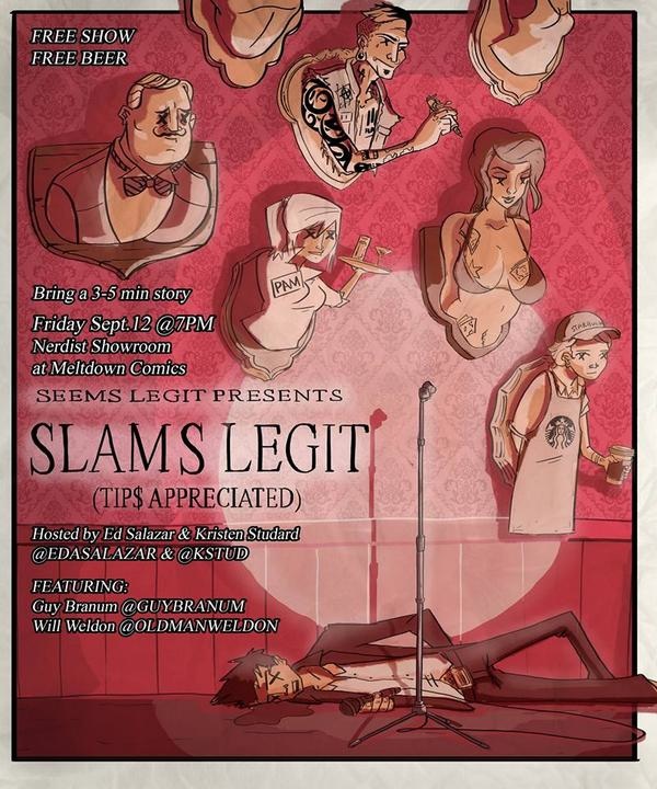 It’s outrageous storytelling only this time YOU will be getting involved. TOMORROW, September 12, at NerdMelt Showroom the Seems Legit will be doing a special edition of their show where an audience member may get the opportunity to tell a story or flat out lie to everyone. It’s SLAMS LEGIT! Come prepared with a 3-5 minute tale pertaining to the “Tips Appreciated” theme. Names will be drawn randomly and one person will be the liar. It might be a good idea to think up a true story and a most fib-licious one, as well. Bwahahahaha! The comedic judges for the evening will include Will Weldon and Guy Branum. Ed Salazar and Kristen Studard will be hosting all the fun. Invite your friends and come down for one hell of a Friday!