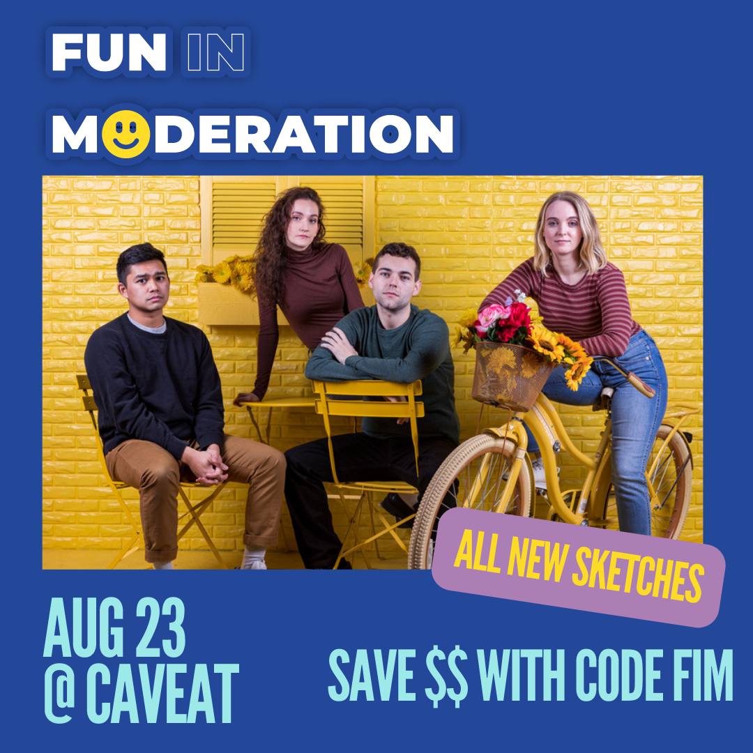 What did mama always say, “everything in moderation.” Wouldn’t want to go against the grain now, so get those sensible kicks in with some FUN IN MODERATION August 23rd at Caveat NYC. The four-person sketch comedy group (ft Kendall Bowden, Austin Elias-de Jesus, Syd King, and Nick Ryan) offers a famously good time where sketch comedy, stand-up, games and surprises all jiving in one place. Laughs will be had, love may be found, and if you’re lucky, you might even get a little consensual kiss on the cheek. Did we mention the opener will be SNL writer Vanessa Jackson? HEY, that’s teetering on reckless abandon! Calm down, it will all be fine. Enjoy and do the clickey below!