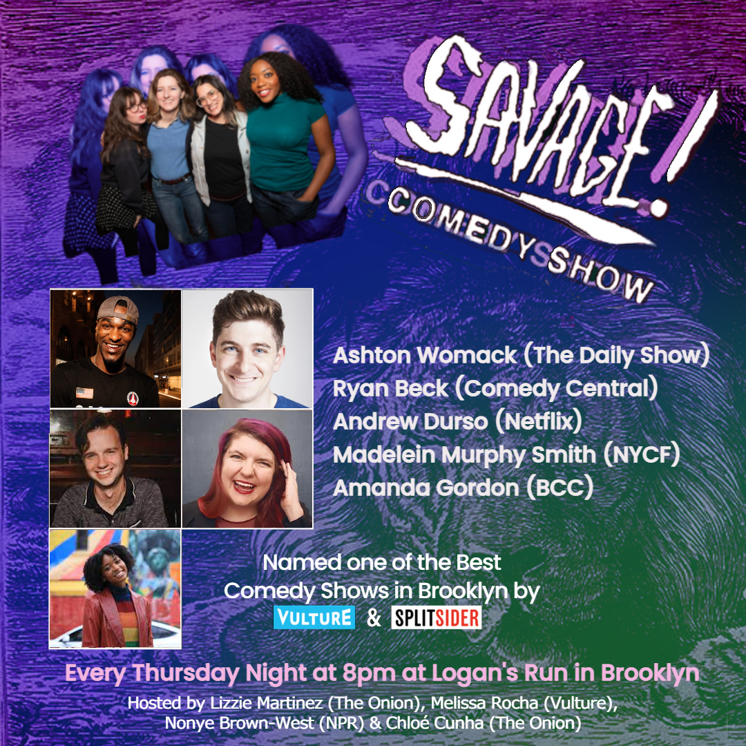 Get SAVAGE with your comedy by starting your Memorial Day celebrations early! Named one of the Best Comedy Shows in Brooklyn by Vulture and Splitsider, Savage Comedy offers up NYC’s greatest comedy notables at Logan’s Run in Park Slope. TONIGHT your hosts Lizzie Martinez, Melissa Rocha, Nonye Brown-West, and Chloé Chunha, will welcome