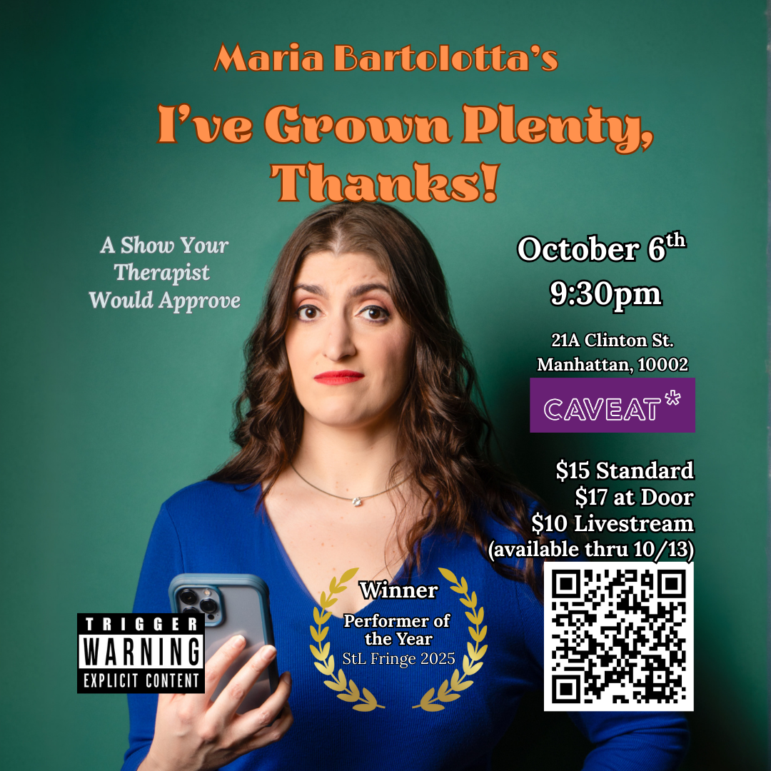 Mentions: Show 9:30pm ET. Tickets HERE. This show features emotionally challenging content CW/TW. Location: Caveat | 21A Clinton St. Manhattan, 10002. Give Maria a FOLLOW. Feed the algo.
