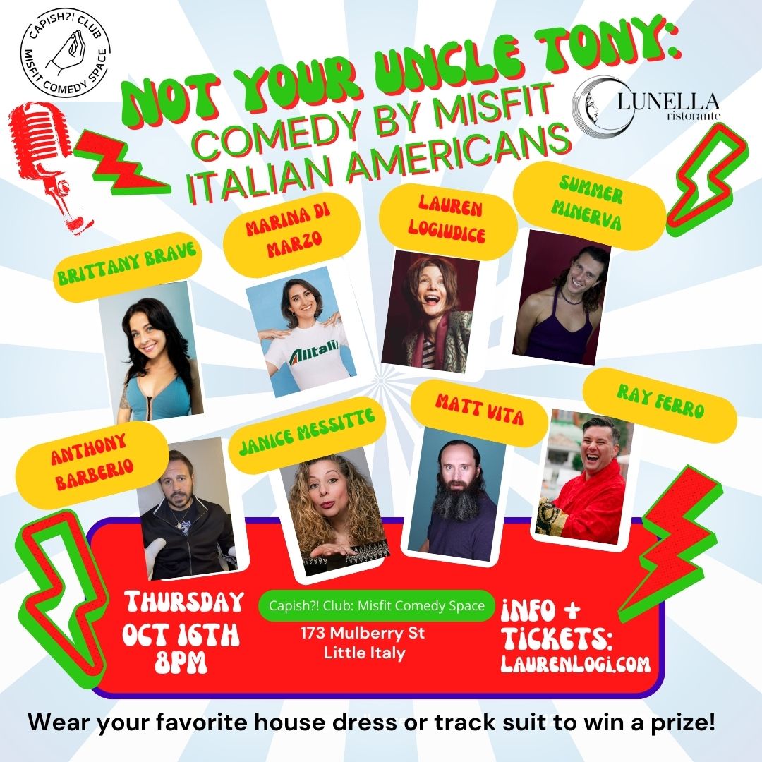 Join misfit Italian Americans as they joke about their crazy families and cultural chaos that anyone can relate to. Friday, October 16th, NOT YOUR UNCLE TONY will feature Special Guest Summer Minerva in addition to comics