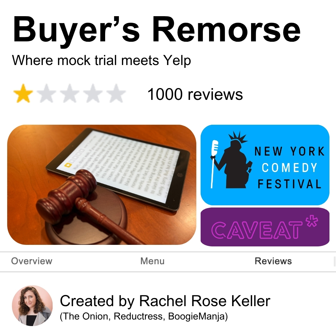 BUYER’S REMORSE, happening this Saturday, November 8th at Caveat, is a fast-paced improvised mock trial comedy show where rotating panels of comedians argue topics of the highest stakes: whether a negative review of a business/restaurant gets to stay online vs. get taken down. Did anyone pass the Bar Exam? No. Will the reviews actually be taken down? Probably not. Will this show reach over-the-top hilarity? Absolutely.