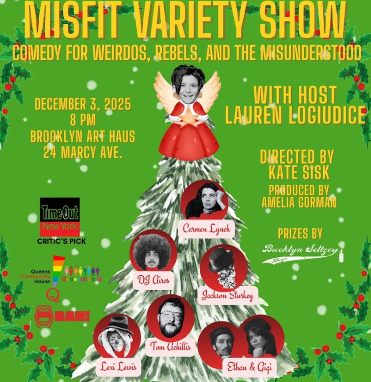 Brave the almost winter weather to enjoy a heartwarmingly irreverent joyride for the weirdos, rebels, and the misunderstood. MISFIT Variety Show is hosted by Lauren LoGiudice (HBO) who will be assembling a a cast of eclectic comedy performers this Wednesday, December 3rd at Brooklyn Art Haus in Williamsburg. The lineup, blending comedy, storytelling, and character acts, will include this gaggle of nog enthusiasts: