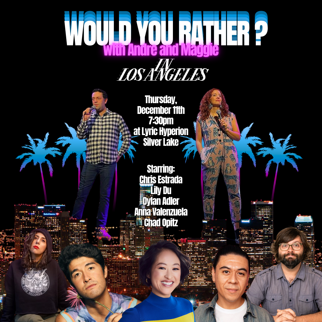 Would You Rather? with Andre and Maggie is heading west this holiday season for a very special show at Lyric Hyperion. Hosted by Andre Medrano (Don’t Tell Comedy, ViceTV) and Maggie Maxwell (NBC, Reductress), the show has been a favorite in New York City (and across the country since 2018), bringing quick wit and unpredictable fun to every stage.