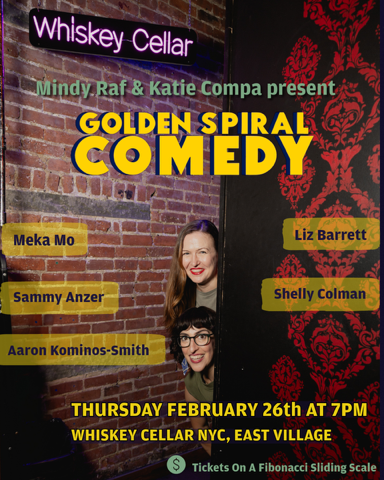 Golden Spiral is back with Fibonacci flair TONIGHT at the Whiskey Cellar NYC! Named by TimeOut NY as one of the best comedy shows run by women, hosts Mindy Raf and Katie Compa bring together a lineup of top comics working in New York and beyond as they welcome you into the Golden Spiral on the last Thursday of the month.