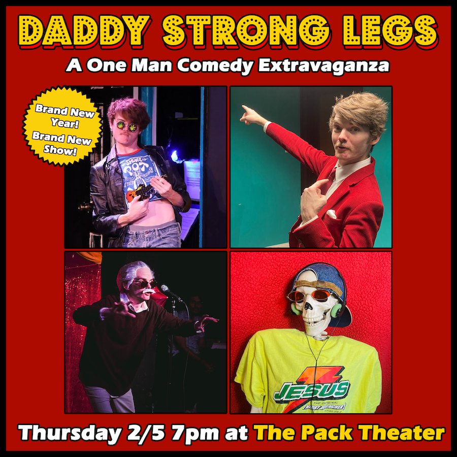 GARRETT BUSS returns for another installment of DADDY STRONG LEGS TOMORROW, MARCH 5TH at the Pack Theater. DSL is a one-man comedy extravaganza that is an unforgettable spectacle! It’s essentially an hour of characters Garrett CUSS (an evil bad boy who can do kickflips and swing nunchucks), the Ghost of Stan Lee (Spider-man’s Dad), and Boney Skele Tony, a skeleton who was once in a barbershop quartet but is now a radical tween. Garrett plays songs, does standup, dances, and has an all around great time with audiences. This is a “one man, one guy, one ghost, one skeleton show” you won’t wanna miss!
