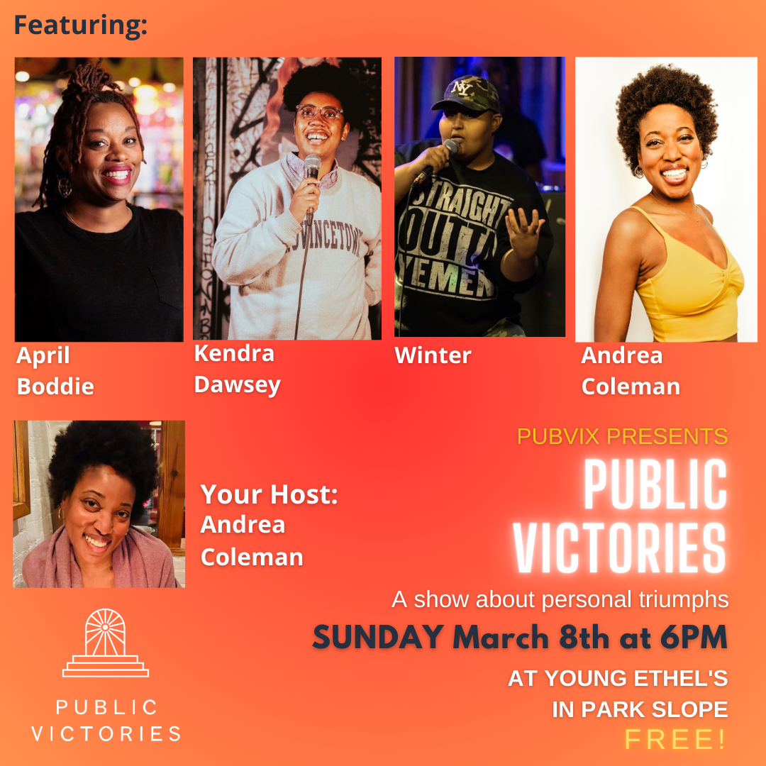 PUBLIC VICTORIES is true stories of winning, great and small. From changing the sheets to changing your mindset – personal victories will be on display! Public Victories features 4 performers and 1 audience member each telling a true story about a win, triumph, or victory. This month’s performers: