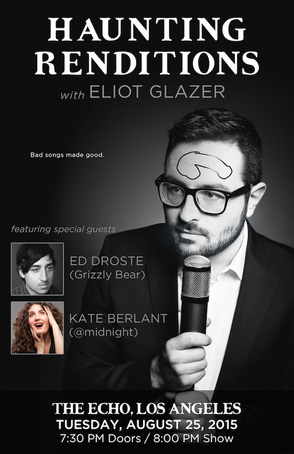 You probably recognize this fellow from Broad City where he played Ilana Wexler’s brother, Eliot ( who we met at Grandma Esther’s Shiva). ELIOT GLAZER doesn’t only makes folks laugh for living though. He’s a classically-trained singer who can belt out a tune like nobody’s business. Tuesday, August 25th the comedian/actor/writer/singer will be bringing his vocal talents to The Echo in Los Angeles. Fellow comedian Kate Berlant and Ed Droste of Grizzly Bear will join Glazer for an evening of hilarious Haunting Renditions. What am I talking about, you ask? Based on Glazer’s web series of the same name, Haunting Renditions Live features Glazer turning the most iconic pop tunes of the age into sophisticated works of art. And what makes the show especially funny are Glazer’s humorous introductory dissections of the songs, in addition to other special treats. But enough from me, get to know more about the show and the man behind these wonderful parodies THIS minute. Enjoy!