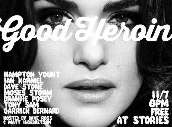 Have you been to a GOOD HEROIN show yet? The year is almost up, kids! Check off a box on your bucket list and see this Saturday’s show (Nov 7) with the insanely funny Hampton Yount. Yount will be performing a nice, long set at the show. What a tremendous treat! But that’s not all, these other fabulous comedians will have you laughing so hard you’ll beg for mercy: