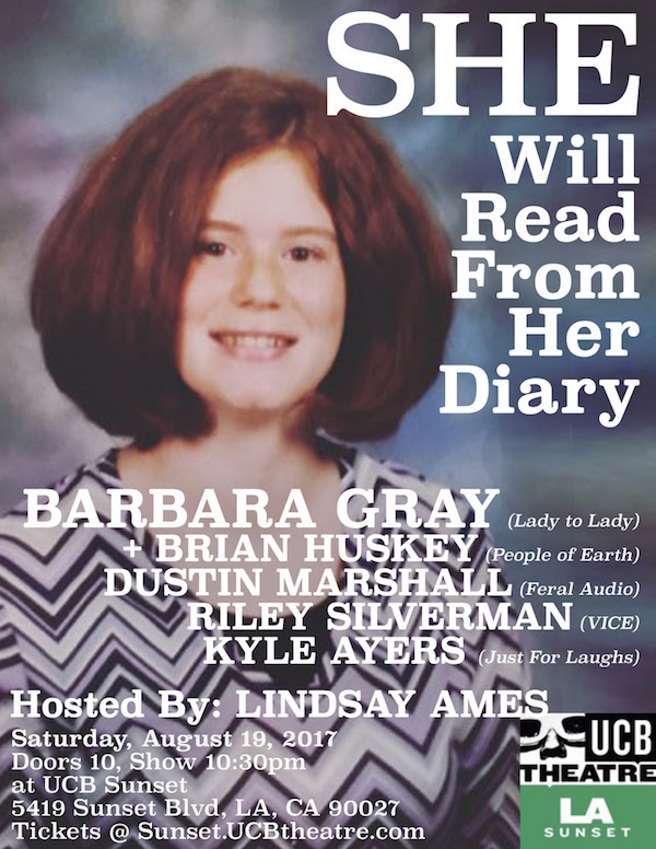 Do you enjoy truth? Do you like comedy? Do you yearn for diary secrets to be divulged? What if some of the best LA comics and celebs explored their dusty diary contents through stand-up, storytelling, sketch, video and other forms of cathartic unveiling? I’ll tell you WHAT! You’d have the monthly hit UCB show Lindsay Ames’ MY DIARY. Saturday, August 19th, Ames will bring together respected members of the community to dole out some truth about their lives at this funny, one-of-a-kind show. This month’s performers include: