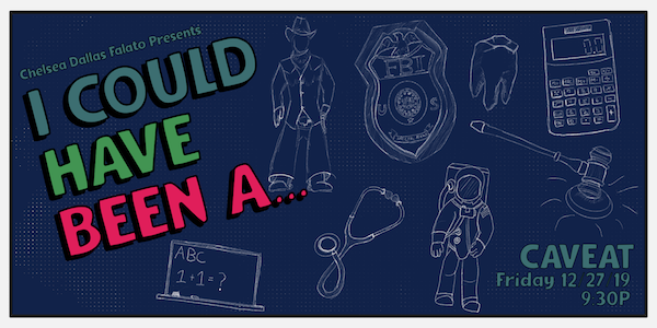 The days of relatives prodding and poking at your person and lifestyle are approaching. I can just about hear you prematurely aging in anticipation. Well, folks, you now have a place to escape that anxiety. Friday, December 27th at Caveat, come forget those family interactions for just one moment. At I COULD HAVE BEEN A… you’ll be treated to New York’s finest comedians having a discussion on what their careers could have been. What?! You mean some comics didn’t always have the goal of rocking the performing arts field? Color me surprised! (Truth be told I always wanted to be a vet). This December host Chelsea Dallas Falato will welcome these multi-faceted humans to the stage: