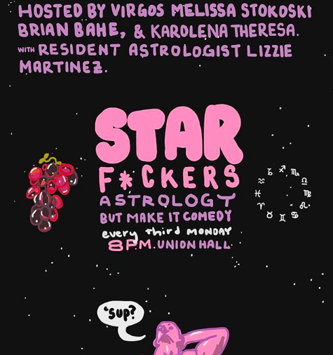 This month at STAR F*CKERS, it’s the age of Aquarius. Yes, the eleventh astrological sign in the Zodiac is getting it’s moment in the spotlight. February 17th at Union Hall, join the comedy show about the science of astrology. That’s a thing? It is now! Your Virgo hosts Melissa Stokoski, Karolena Theresa and Brian Bahe, along with Resident Astrologist Lizzie Martinez (Taurus), will welcome a lineup which just so happens to be born under the current zodiac sign. Your Aquarian go-getters will include: